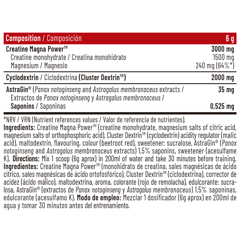 Creatine Magna Power™ (monohidrato de creatina, sales magnésicas de ácido cítrico, sales magnésicas de ácido ortofosfórico), Cluster Dextrin™ (ciclodextrina), corrector de acidez (ácido málico), maltodextrina, aroma, colorante (rojo de remolacha), edulcorante: sucralosa, AstraGin® (extractos de Panax notoginseng y Astragalus membranaceus) 1,5% saponinas, edulcorante (acesulfamo K).
