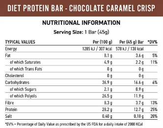 - Chocolate y Caramelo Crujiente: Barra de proteína con sabor a chocolate y crujientes de caramelo.