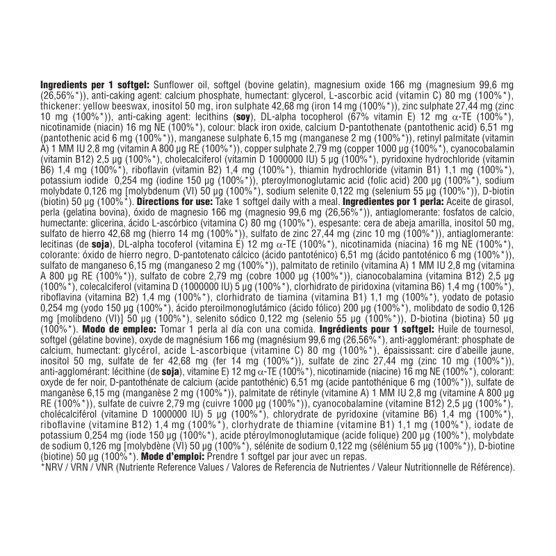 Aceite de girasol , agente de recubrimiento: gelatina, antiaglomerante: calcio fosfato dibásico, humectante: glicerina, óxido de magnesio 166mg (magnesio 99,6mg (27%*)), vitamina C (ácido L-ascórbico) 80mg (100%*), espesante: cera amarilla de abejas, inositol 50mg, sulfato de hierro monohidrato 42,68mg (hierro 14mg (100%*)), sulfato de zinc monohidrato 27,44mg (zinc 10mg (100%*)), antiaglomerante: lecitina de soja Verolec no GMO, vitamina E natural (D-alfa tocoferol) 12mg (100%*), vitamina B3 (nicotinamida) 16mg (100%*), colorante: E-172, vitamina B5 (D-pantotenato de calcio) 6,51mg (ácido pantoténico 6mg (100%*), manganeso (II) sulfato monohidrato 6,15mg (manganeso 2mg (100%*), vitamina A (palmitato de retinol) 2,8mg (vitamina A 800µg RE (100%*)), cobre (II) sulfato monohidrato 2,79mg (cobre 1000µg (100%*)), vitamina B12 (cianocobalamina 0,1%, maltodextrina) 2,5mg (vitamina B12 2,5µg (100%*)), vitamina D3 (1000000 IU) 0,2mg (vitamina D3 5µg (100%*)), vitamina B6 (clorhidrato de piridoxina) 1,71mg (vitamina B6 1,4mg (100%*), vitamina B2 (riboflavina) 1,4mg (100%*), vitamina B1 (mononitrato de tiamina) 1,27mg (vitamina B1 1,1mg (100%*)), yodato potásico 0,254mg (yodo 150µg (100%*), vitamina B9 (ácido fólico) 200µg (100%*), sodio molibdato 2-hidrato 0,126mg (molibdeno 50µg (100%*)), selenito sódico 0,122mg (selenio 55µg (100%*)), vitamina B8 (D-biotina) 50µg (100%*).