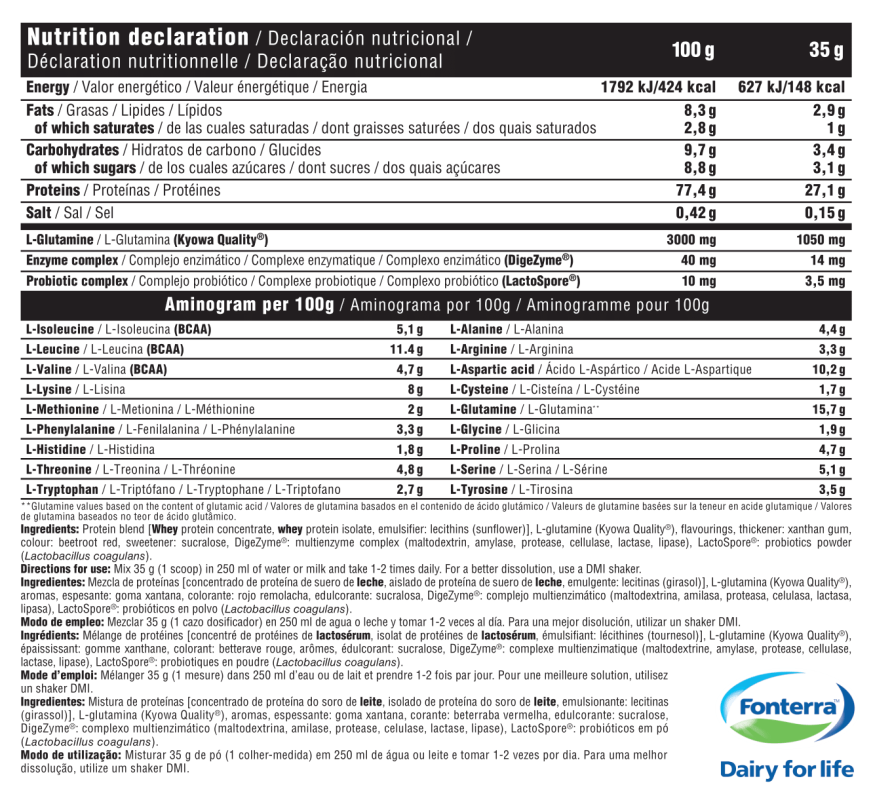 Mezcla de proteínas [concentrado de proteína de suero de leche (emulgente: lecitina de girasol, aislado de proteína de suero de leche (emulgente: lecitina de girasol)], cacao desgrasado en polvo, L-glutamina (Kyowa Quality®), aromas, espesante: goma xantana, edulcorante: sucralosa, mezcla de enzimas digestivas DigeZyme® (amilasa, proteasa, lipasa, lactasa, celulasa), complejo probiótico LactoSpore® (Bacillus coagulans).