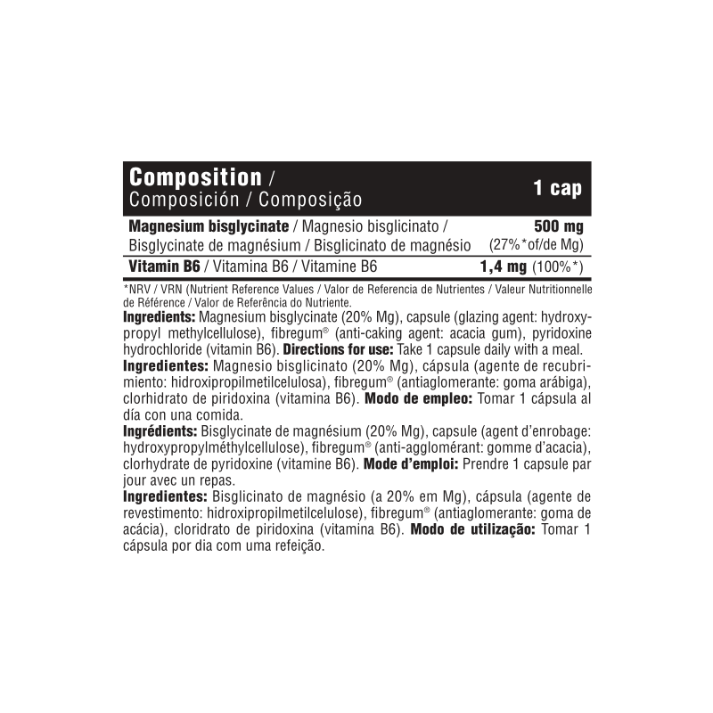 Magnesio bisglicinato (20% Mg), agente de recubrimiento: hidroxipropilmetilcelulosa, antiaglomerante: fibregum® (goma de acacia), vitamina B6 (clorhidrato de piridoxina).