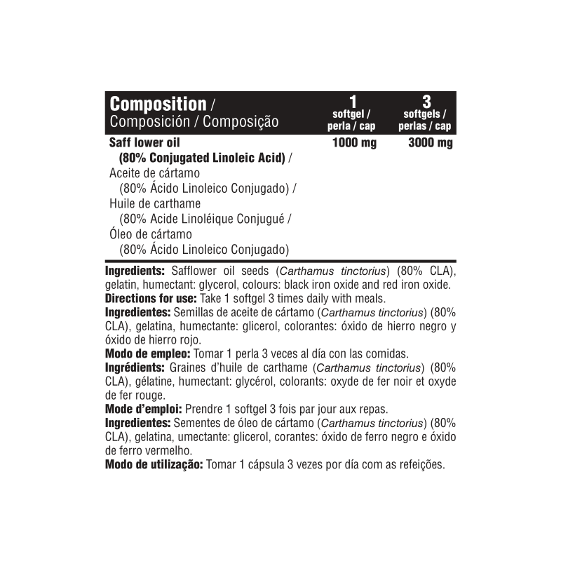 Aceite de cártamo (Carthamus tinctorius, semillas) (80% CLA), envolvente: gelatina y glicerina, colorantes: óxido de hierro rojo y óxido de hierro negro.