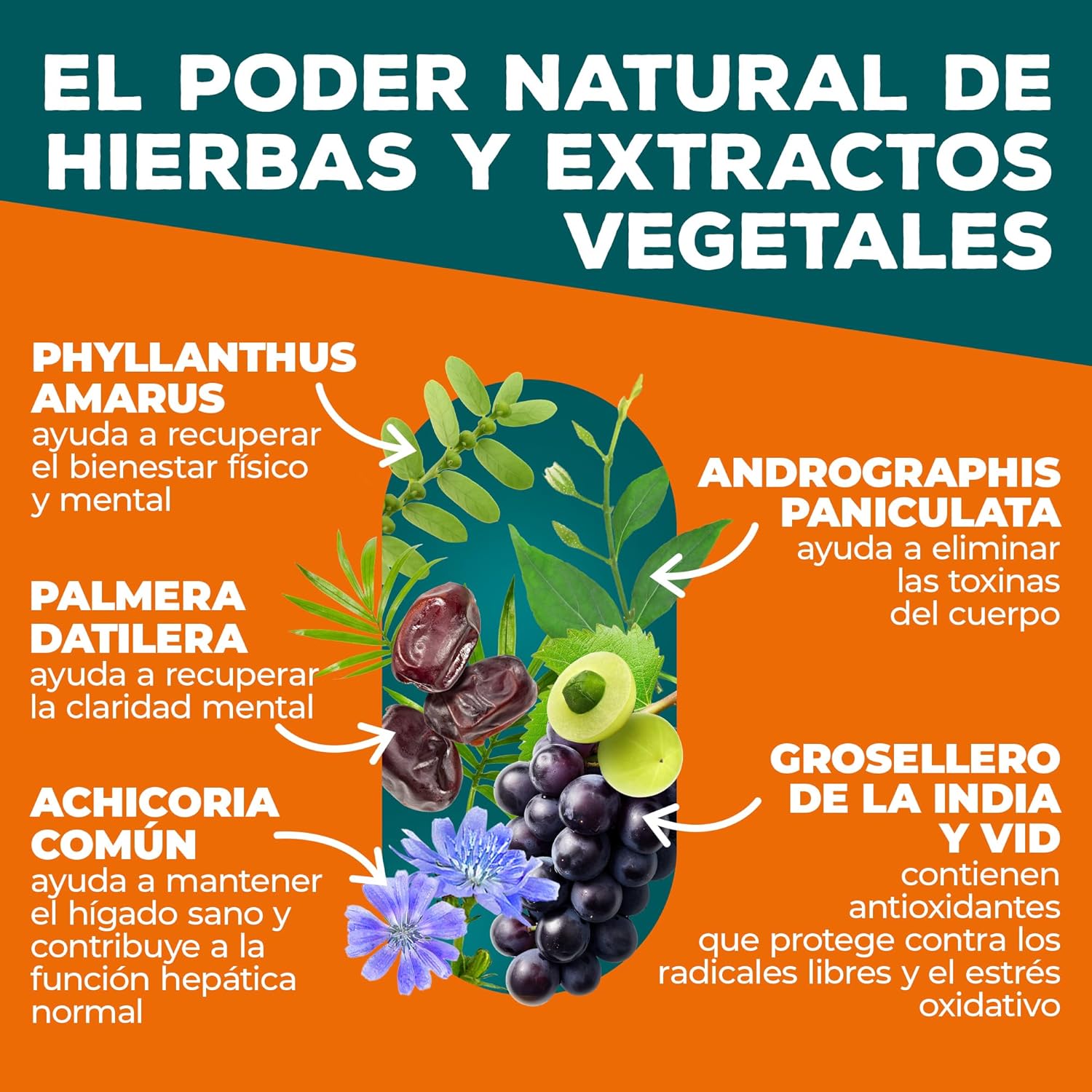 Ingredientes herbales de calidad: Este suplemento está formulado con Andrographis, achicoria, uvas y dátiles, ingredientes que ayudan a eliminar el acetaldehído, un subproducto de la metabolización del alcohol, de la sangre. ¡Con solo una cápsula, tienes el respaldo que necesitas!