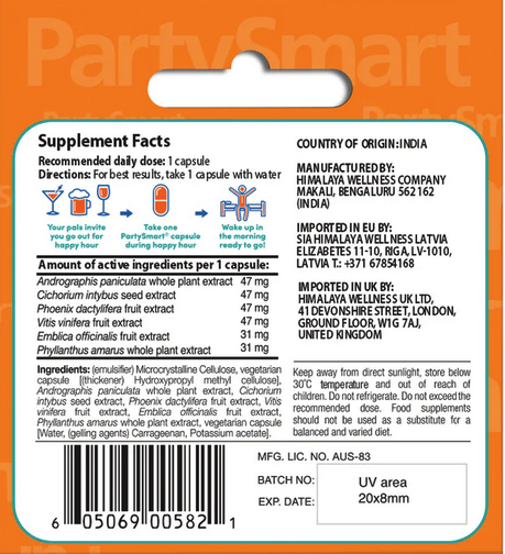 PartySmart de Himalaya, clínicamente probado, Aumenta la capacidad del hígado para procesar el alcohol mientras descansas, convirtiéndose en el complemento ideal para disfrutar de una noche sin preocupaciones y despertar renovado al día siguiente. Contiene ingredientes herbales cuidadosamente seleccionados que benefician el hígado.