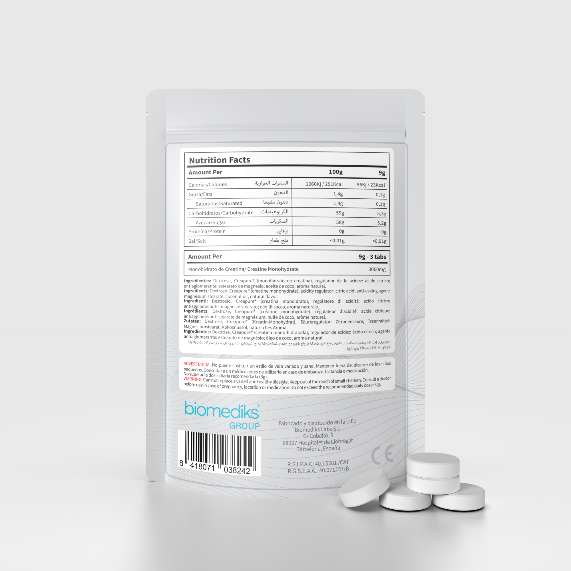 Ingredientes: Dextrosa, Creapure® (monohidrato de creatina), regulador de la acidez: ácido cítrico; antiaglomerante: estearato de magnesio; aceite de coco, aroma natural.