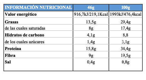 • Bajo en carbohidratos: Solo 8.8% de carbohidratos por 100 g.