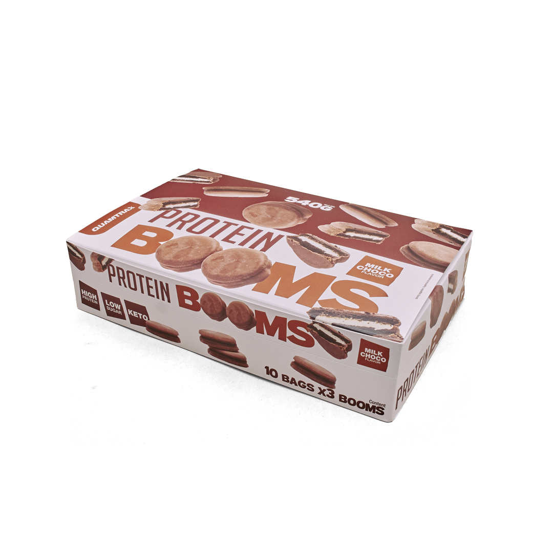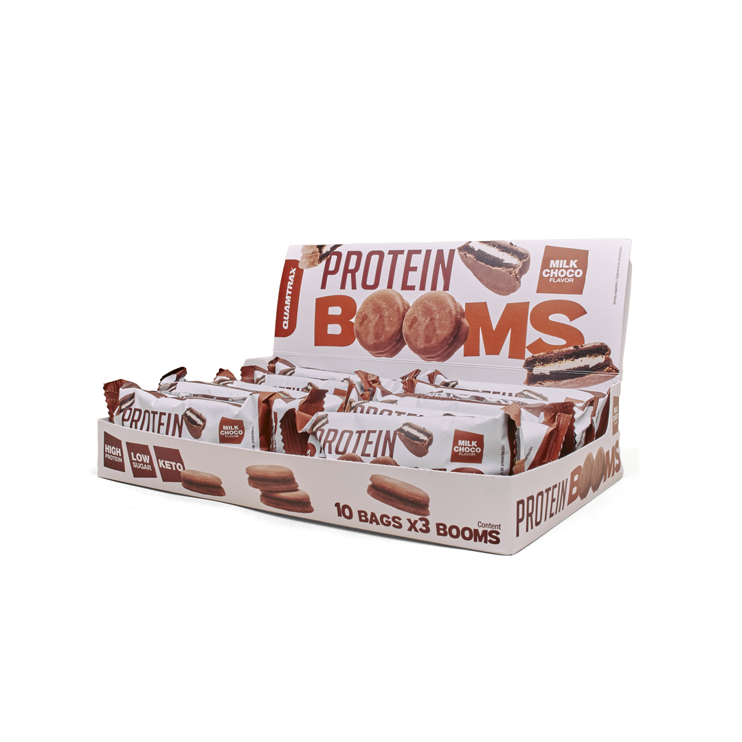 Descubre Protein BOOMS de Quamtrax, unas galletas altas en proteína recubiertas de delicioso chocolate con leche, diseñadas para quienes buscan un snack nutritivo, bajo en azúcares y con pocos hidratos de carbono. Estas galletas crujientes y cremosas son ideales para disfrutar después del gimnasio o como una merienda saludable en cualquier momento del día. Con un equilibrio perfecto entre sabor y nutrición, Protein BOOMS se convertirá en tu elección favorita para satisfacer tus antojos mientras cuidas tu alimentación.